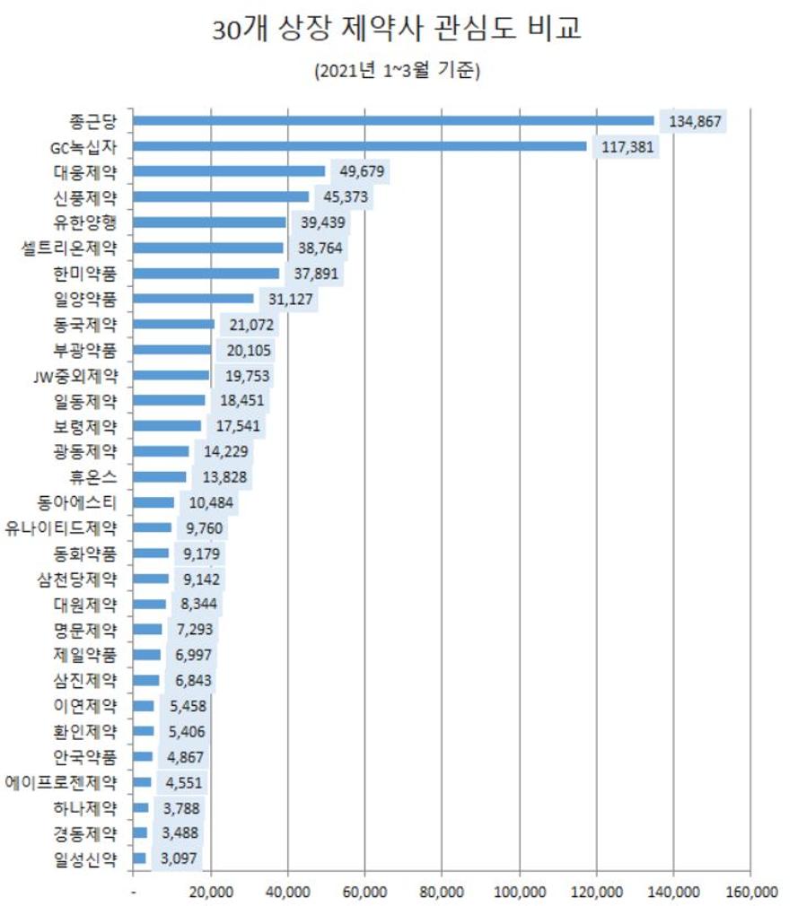 올해 1분기 증시에 상장된 주요 30개 제약사 중 종근당에 대한 관심도가 가장 높았으며, GC녹십자, 대웅제약, 신풍제약이 그 뒤를 이었다.