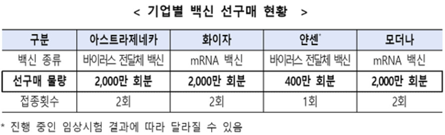 대한민국 정부는 이렇게 불완전한 임상시험 결과를 제시한 백신을 구입해 국민에게 보급할 것인가? 정부는 제약사별로 아스트라제네카 2000만 회분, 화이자 2000만 회분 및 얀센 400만 회분, 모더나 2000만 회분을 선구매한다고 했다. 이를 위해 아스트라제네카는 선구매 계약을 이미 체결했고, 나머지 기업도 구속력 있는 구매 약관 등을 체결해 구매 물량 등을 확정했으며, 나머지 계약 절차도 신속하게 진행할 예정이라고 한다.