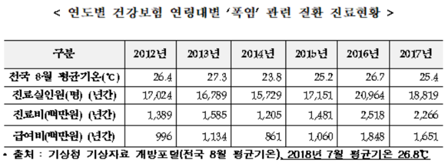 폭염으로 인한 건강보험 진료비는 2012년 13억 9천만 원에서 2017년 22억 7천만 원으로 약 1.6배 증가한 것으로 조사됐다.