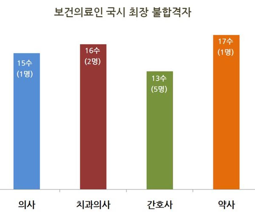 새누리당 김재원 의원이 1일 발표한 한국보건의료인국가시험원 자료에 따르면 의사국시 최장 불합격 횟수는 15수로, 1명이 있었다.