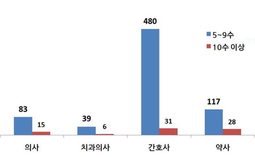 약사국시는 10수 이상이 28명, 5수 이상이 145명이었고, 치과의사는 10수 이상이 6명, 5수 이상이 45명, 간호사는 10수 이상이 31명, 5수 이상이 511명으로 조사됐다.