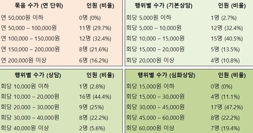 행위별수가의 경우, 기본상담은 회당 5천~1만원, 상담은 1만원 이하, 심화상담은 3만~4만 5천원을 선호했다.