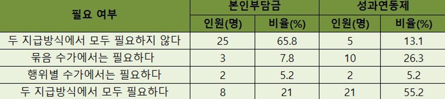 다만, 성과연동제 필요성에 대해서는 공감했다. 2개 수가체계 모두에서 성과에 따른 인센티브가 필요하다고 답했다.