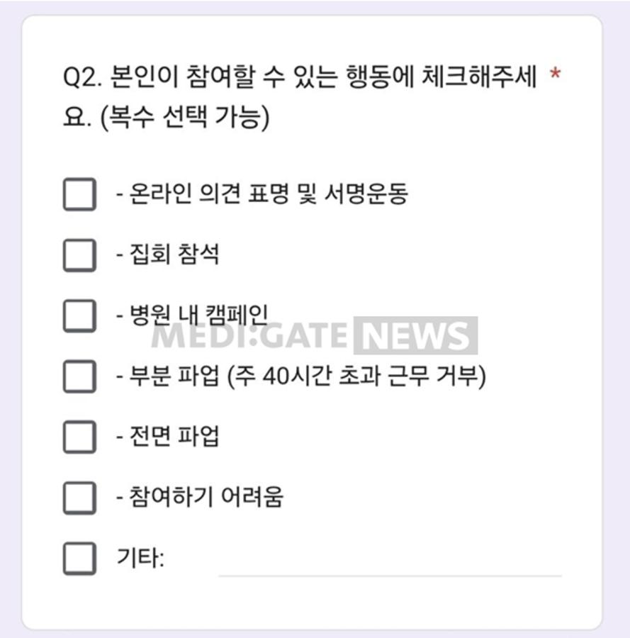 특히 참여할 수 있는 행동으로는 ▲전면 파업 ▲부분 파업(주 40시간 초과 근무 거부) ▲병원 내 캠페인 ▲집회 참석 ▲온라인 의견 표명 및 서명운동 등이 선택지로 제시됐다.