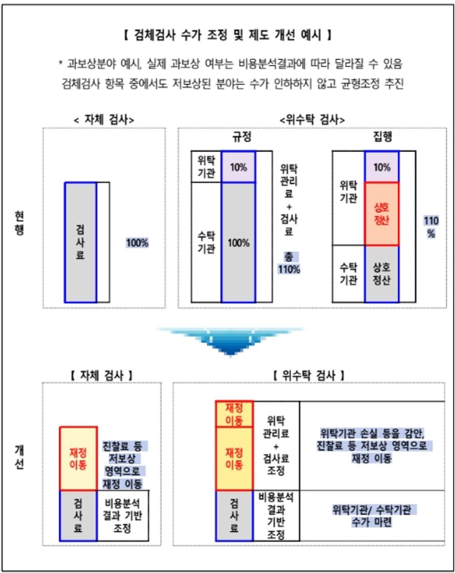 정부는 이러한 문제를 해결하기 위해 검사료와 보상 영역이 중첩되는 위탁검사관리료를 폐지하고, 검사료 내에서 위∙수탁기관별 수가를 신설해 보상체계를 합리화하며 검사료 할인 등을 방지하기 위해 청구∙지급방식을 개선할 계획이다.