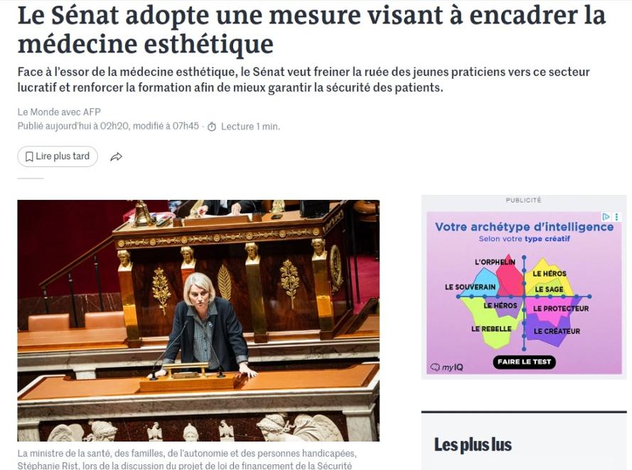 르몽드는 24일 '프랑스 상원이 피부미용 의료를 규제하는 법안을 채택했다'는 보도를 냈다.