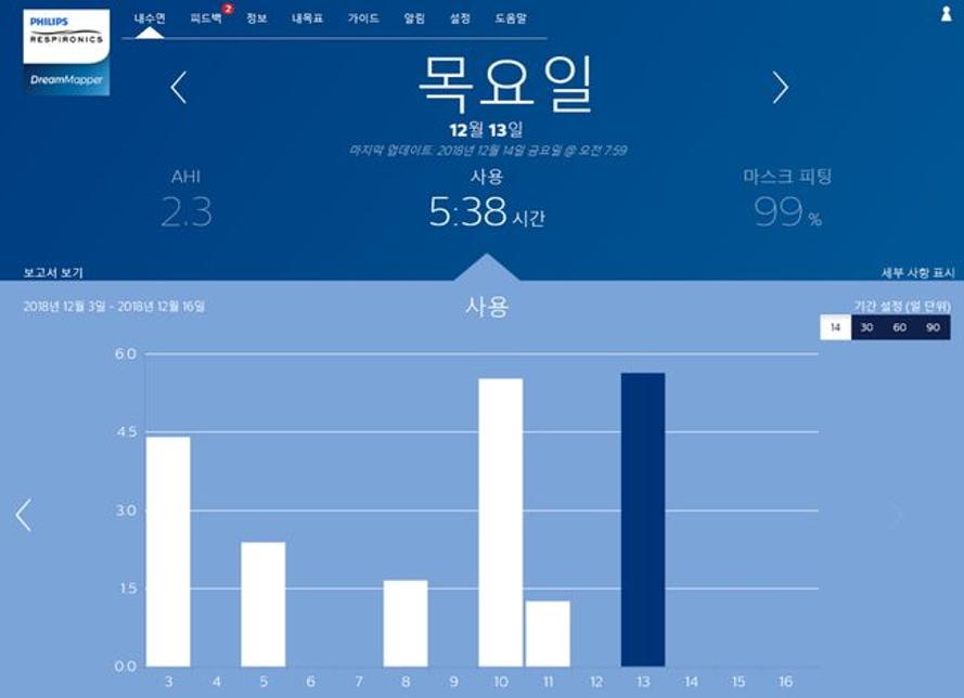 사용 시간은 물론 무호흡-저호흡 지수(Apnea Hypopnea Index, AHI)와 마스크가 정확하게 착용됐는지(Mast Fit) 등의 데이터를 보여주며 각 항목 별로 일정 기간 수치 변화도 그래프로 보여준다.