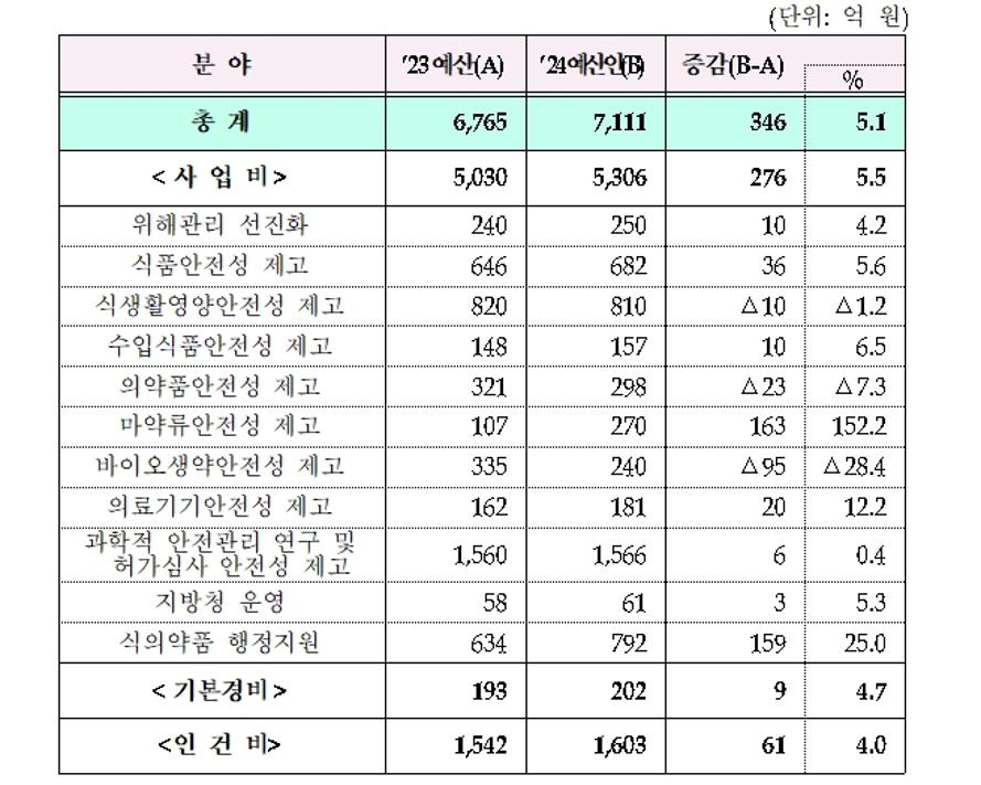 식품의약품안전처는 2024년도 예산안을 올해 예산(6765억원) 대비 346억원 증가(5.1%)한 총 7111억원으로 편성했다고 1일 밝혔다.