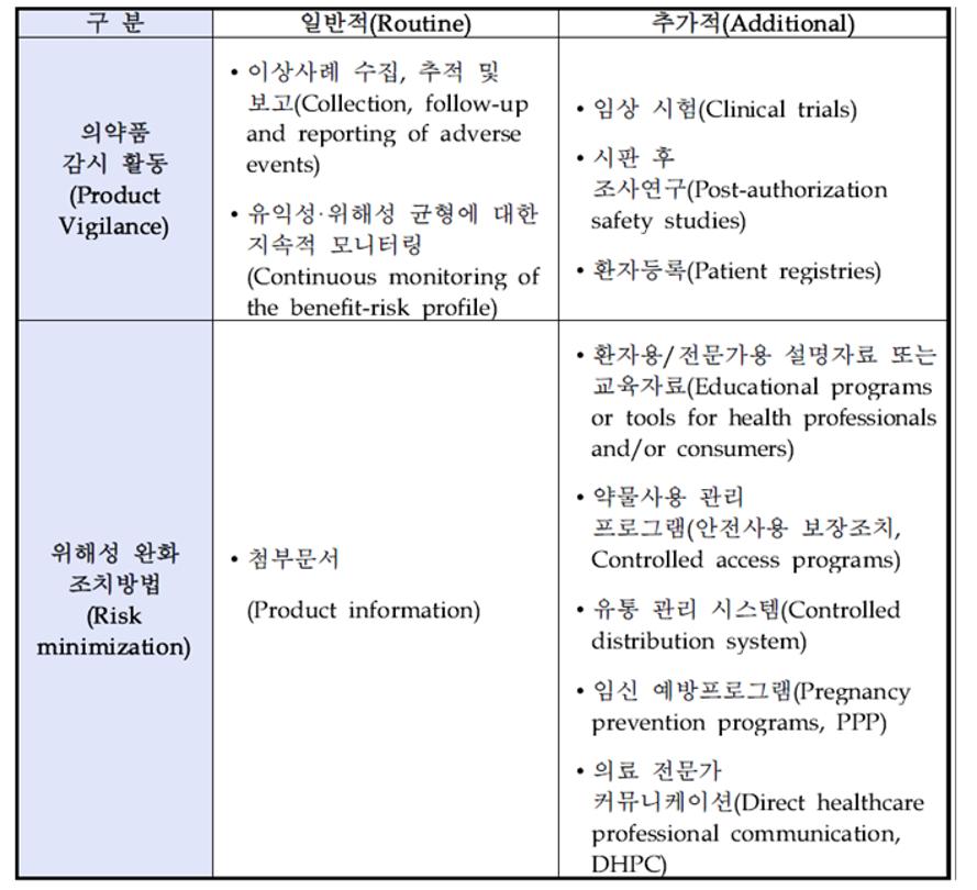 - 의약품 감시계획:일반적 의약품 감시 활동(routine pharmacovigilance plan), 추가적 의약품 감시 활동(additional pharmacovigilance plan)