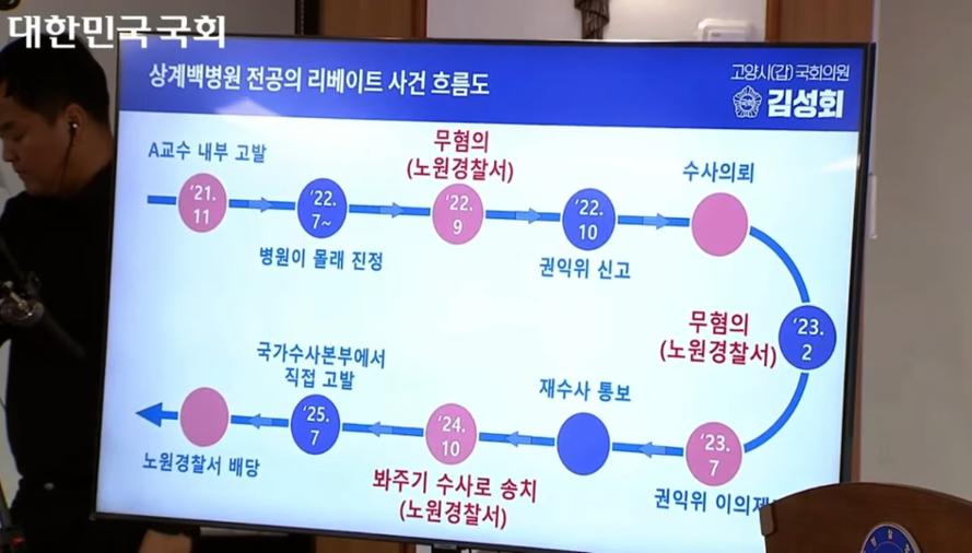 이어 "전공의들이 반성문에서 12개월간 매달 90만 원, 총 1080만 원의 리베이트를 받았다고 진술했는데 이 내용이 수사 결과에서 빠졌다"며 "이 부분이 포함됐다면 전공의는 자격정지 처분을, 병원과 인제학원은 과징금 또는 영업정지 처분을 받을 수 있는 사안이다. 하지만 경찰은 이를 다 덮어줬다"고 비판했다. 이에 그는 "노원경찰서와 관내 백병원 사이의 유착 여부도 밝혀야 한다"고 강조했다.