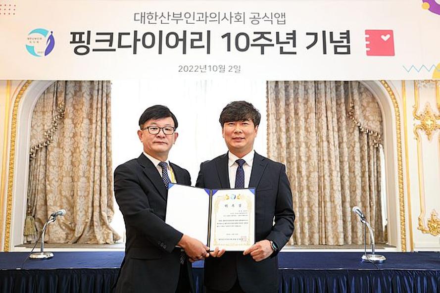 이날 김재연 회장은 대한산부인과의사회 공식 앱 핑크다이어리를 운영하고 있는 NHN에듀 정동석 이사에게 그 동안의 공로를 인정해 공로패를 수여했다.