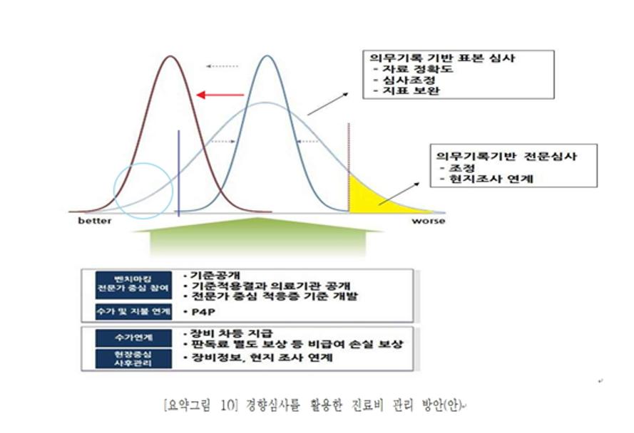 위 표는 올해 3월 심평원이 발표한 ‘기준비급여 급여화에 따른 진료비 심사 관리방안 연구’ 라는 보고서에 나오는 도표다. 도표의 'worse'에 가까운 노란 부분에 해당할 경우 전문심사를 하거나 조정과 현지조사를 연계하겠다는 의도를 보여줬다.