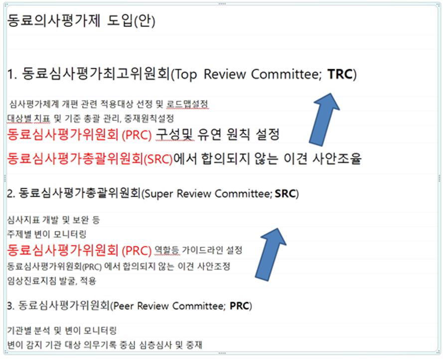 최근 다시 한번 발표된 경향심사는 동료의사 평가제도로 진화하고 있다. 위 표의 화살표를 주목하면 TRC, SRC, PRC를 보면서 옥상옥(屋上屋)이 떠오른다. 의료공급자의 주장이 묻힐 가능성이 높아진다. 이런 구조를 탈피하는 위원회 구성과 결정구조를 만드는 것부터 필요하다.