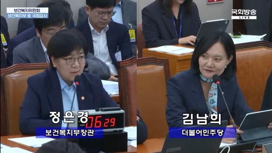(왼쪽부터) 보건복지부 정은경 장관, 더불어민주당 김남희 의원. 사진=국회방송