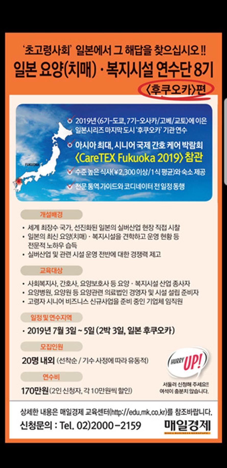 매경교육센터는 오는 7월 일본 요양 복지시설을 방문해 선진 간병 시스템과 치매돌봄 노하우를배우는 프로그램을 마련했습니다. 지난 2월과 4월 도쿄와 간사이지방(오사카, 고베 등)을 순회한데 이어 마지막 도시로 후쿠오카 연수룰 진행합니다.