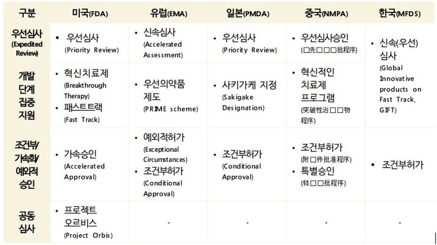 보고서에 따르면 미국은 기존의 우선심사(Priority Review), 혁신치료제(Breakthrough Therapy) 지정 외에도 더욱 세분화된 신속심사 제도를 도입하며 규제 유연성을 극대화하고 있다.