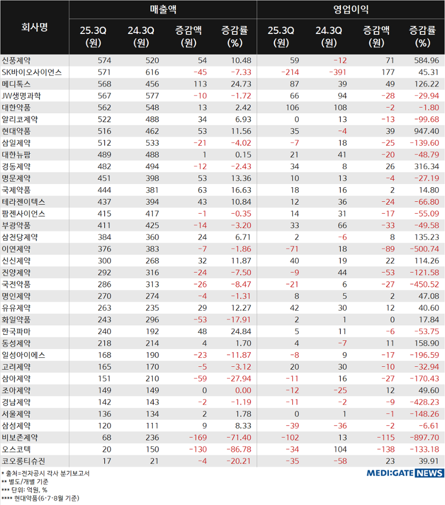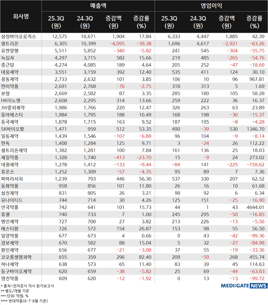 반면 일부 대형·중견 제약사는 수익성이 악화됐다. 동아에스티는 매출 증가에도 불구하고 판관비 부담이 커지며 이익이 역성장했다. SK바이오사이언스는 주요 파이프라인의 임상 진행과 R&D·설비 투자 등으로 영업손실이 이어졌다.