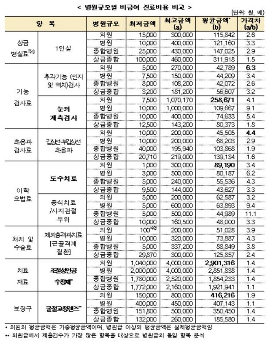 조사결과 전반적으로 의원급이 병원급에 비해 비급여 비용이 대체로 낮으나 눈 계측검사, 도수치료, 조절성인공수정체, 굴절교정렌즈 등 일부 항목에서는 병원급보다 높았고 다빈도 항목, 기관별 큰 가격차 등에서는 병원급과 유사했다.