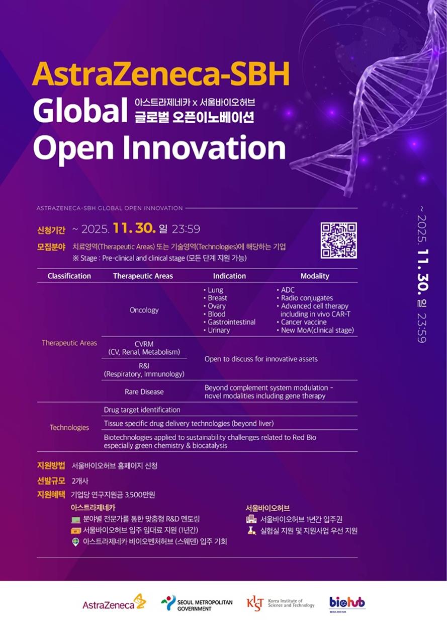 서울바이오허브가 아스트라제네카 한국지사와 공동으로 추진하는 ‘2025 한국아스트라제네카-서울바이오허브 글로벌 오픈이노베이션’ 프로그램의 참여기업 모집을 시작했다고 20일 밝혔다.