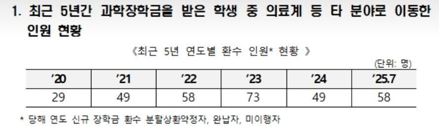 이들은 장학금 수혜 후 과정 중도 포기 또는 졸업 후 의료계 등 비이공계 종사로 장학금 환수 대상자로 분류됐다.