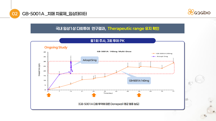 회사 측은 "다회 투여(4회) 시뮬레이션 결과, 아리셉트 10mg은 GB-5001A 280mg과, 아리셉트 5mg은 GB-5001A 140mg과 각각 항정상태에서 동등한 수준을 보일 것으로 예상했다"고 밝혔다. 현재 다회 투여 연구는 피험자 투약을 모두 마쳤으며, CSR은 3분기 수령이 예상된다.