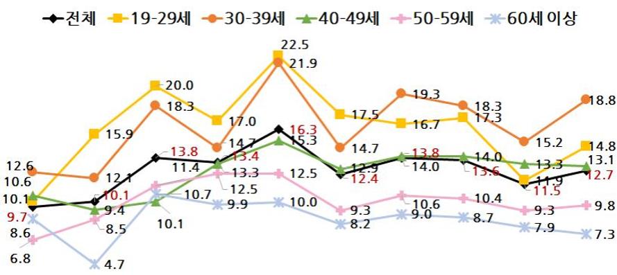 <연령별 자살 생각률(%)> 자료=보건복지부