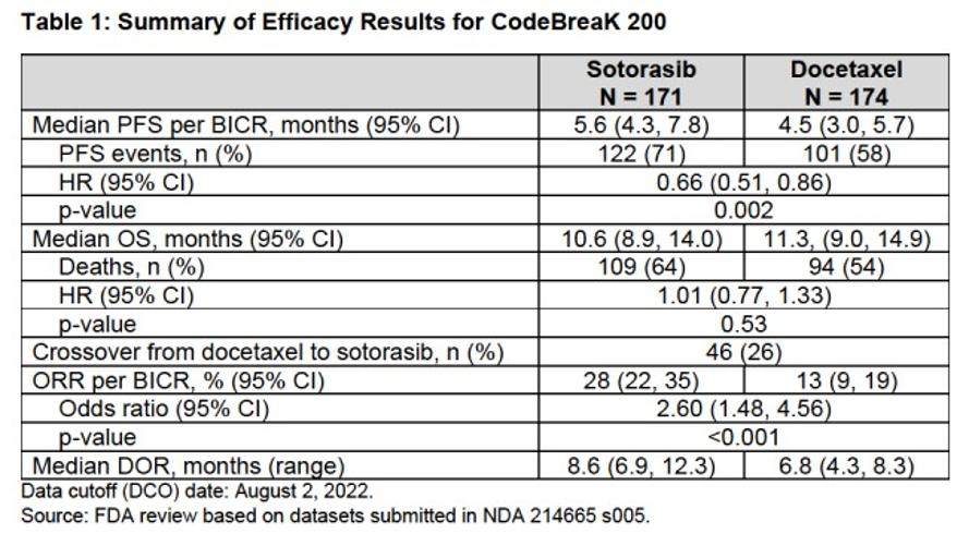 보고서는 "CodeBreaK 100과 200의 객관적 반응률(ORR)은 비교적 일관되게 나타나고 있으며, 이는 ORR 측면에서 일관된 항종양 효과가 있음을 시사한다"면서 "그러나 CodeBreaK 200의 맥락에서 테스트 중인 주요 가설은 소토라십이 도세탁셀에 비해 PFS 이점을 입증하는지 여부였다"고 지적했다.