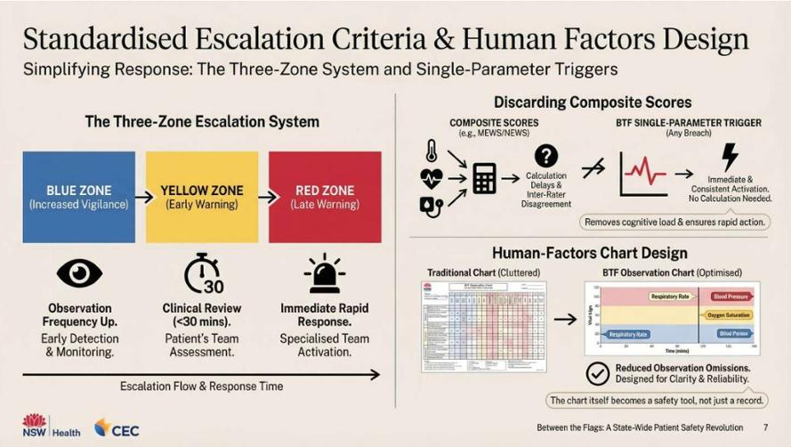 BTF는 병원 내 환자 상태 악화를 신속하게 인지하고 대응하는 표준 입원 환자 안전 시스템이다. 해당 시스템은 환자의 활력징후 변화를 색상 구간으로 구분해 단계별 대응을 유도한다. 구체적으로 정상 상태인 '블루존', 조기 경고 단계인 '옐로우존', 중증 위험 단계인 '레드존'으로 구분된다. 대응 단계는 크게 두 단계로 이뤄진다. '옐로우존'에서는 의료진의 임상 검토와 관찰을 강화하고, '레드존'에서는 신속 대응팀이 즉시 개입한다.
