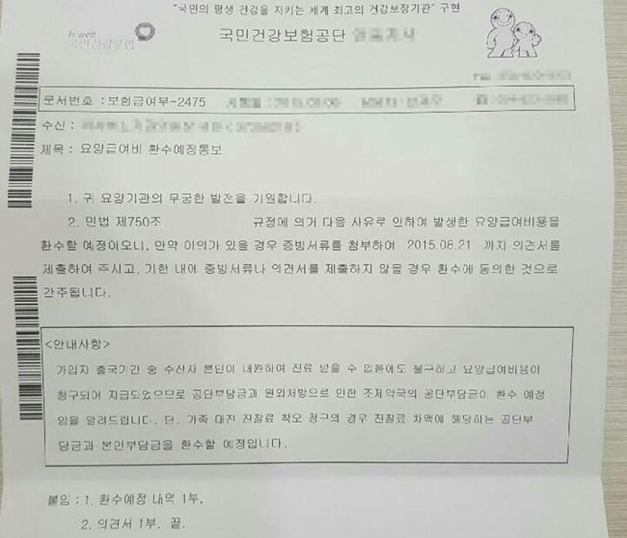 환수예정통보서에는 "수진자가 외국에 출국한 기간 의원에서 진료 받을 수 없음에도 불구하고, 요양급여비용을 청구했으므로 진찰료와 약제비의 공단부담금을 환수할 예정"이라고 적혀 있었다.