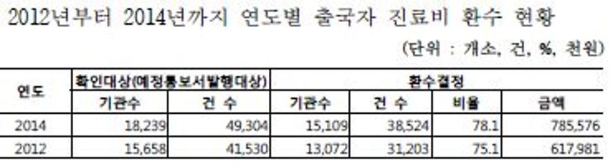 건강보험공단에 따르면 2014년 한해 이처럼 출국자를 진료한 것으로 요양급여비용을 청구한 요양기관이 총 1만 5109곳에 달했고, 총 3만 8524건, 7억 8557만원을 환수했다.