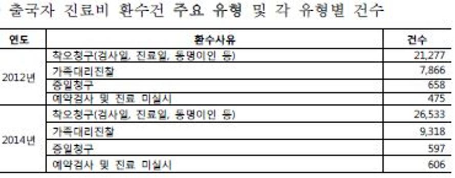 환수 유형을 보면 착오청구(검사일, 진료일, 동명이인 등)가 2만 6533건으로 가장 많았고, 출국자 가족의 대리진찰이 9318건을 차지했다.