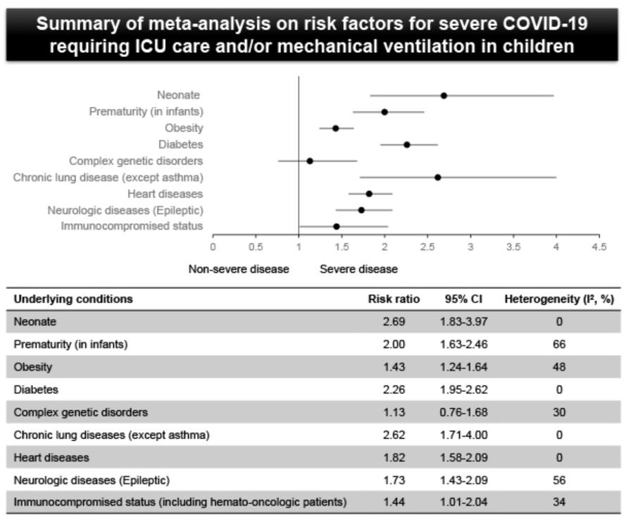 중환자실 케어가 필요하거나 인공호흡기를 써야 하는 소아에서의 중증 코로나19 위험인자 메타분석 요약. 사진=