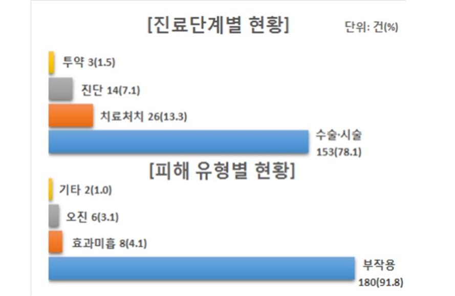 진료단계별로는 수술·시술이 78.1%(153건), 치료‧처치 13.3%(26건), 진단 7.1%(14건), 투약 1.5%(3건) 등의 순으로 나타났다.