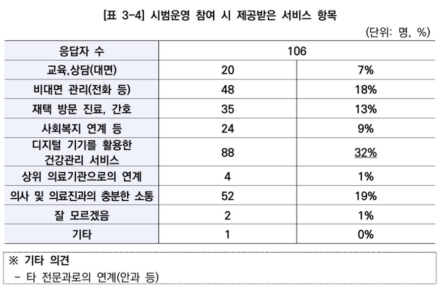 '지역기반 환자중심 일차의료 시범운영에 참여하면서 해당 의료기관으로부터 주로 어떤 서비스를 받았느냐'는 질의엔 '디지털 기기를 활용한 건강관리 서비스'가 88명(32%)으로 가장 많았고 '의사 및 의료진과의 충분한 소통'이라고 답한 이들은 52명(19%)였다.
