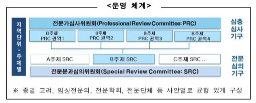 이를 위해 심평원은 전문가심사위원회(Professional Review Committee, PRC)와 전문분과심의위원회(Special Review Committee, SRC)의 2단계 전문심사위원회를 구성·운영한다.