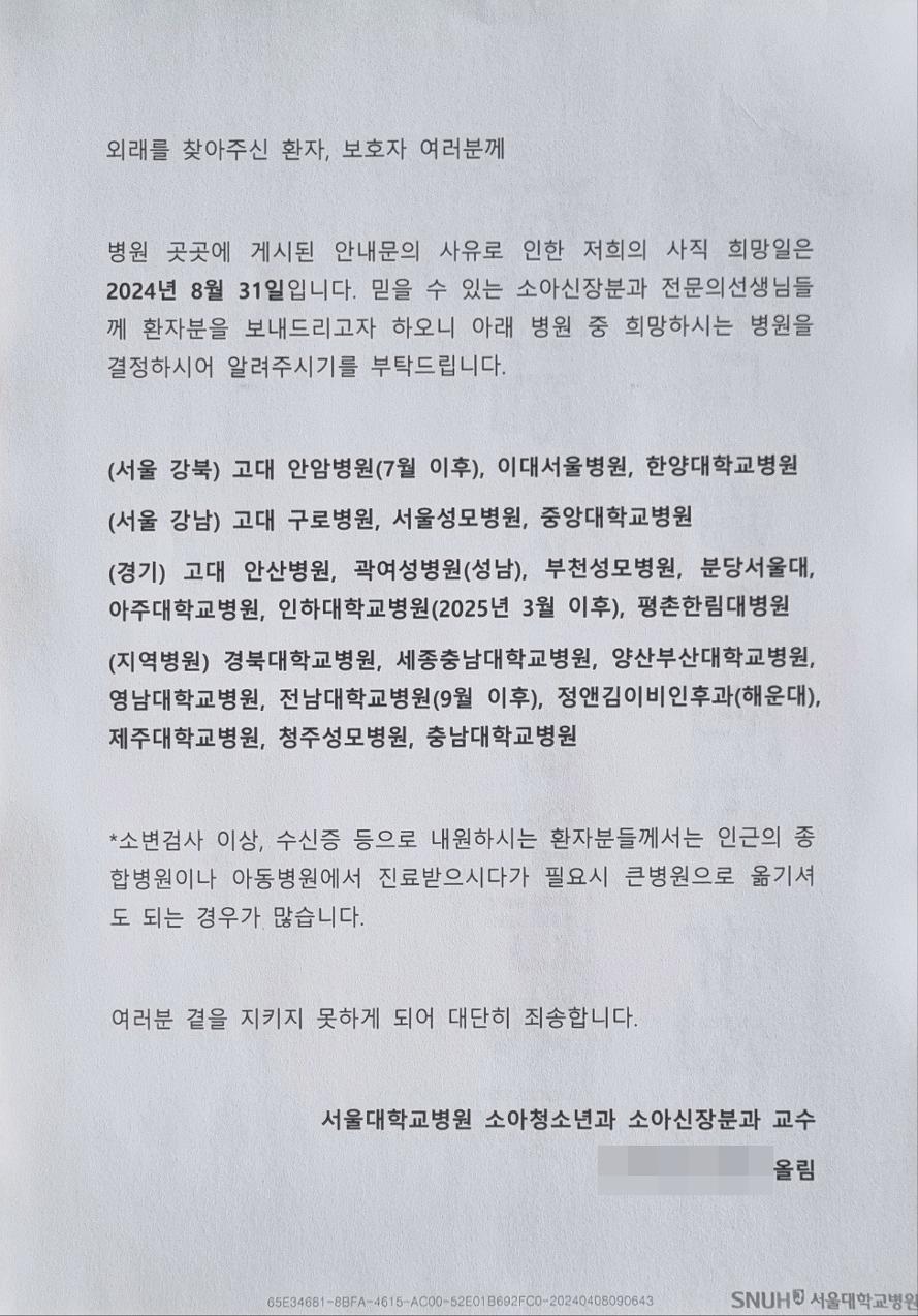 교수들은 "외래를 찾아주신 환자, 보호자 여러분께"라는 제목으로 안내문을 내고 "믿을 수 있는 소아신장분과 전문의에게 환자를 보내드리고자 하니 아래 병원 중 희망하는 병원을 결정해 알려달라"고 밝혔다.