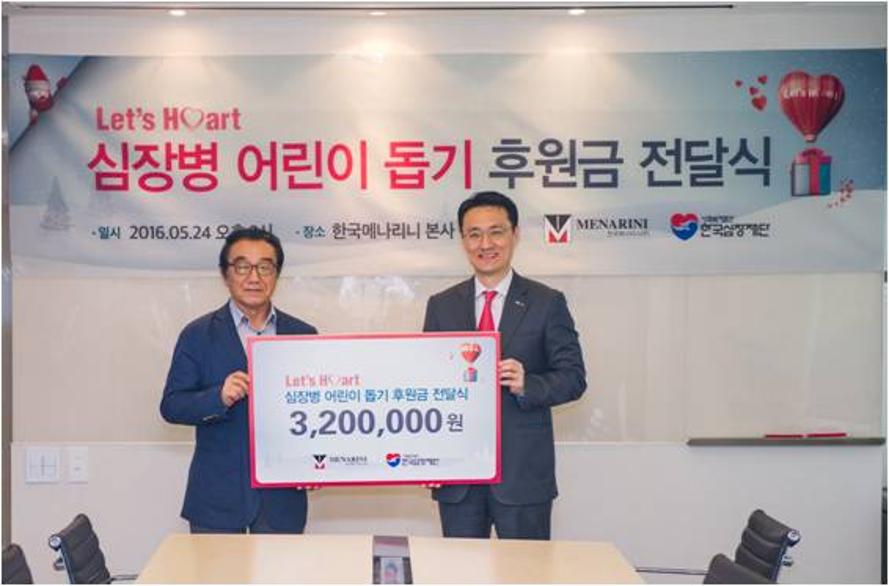 이번 기부금은 한국메나리니가 작년 12월부터 네 달간 진행한 'Let's Heart 캠페인 시즌2'를 통해 마련됐다.