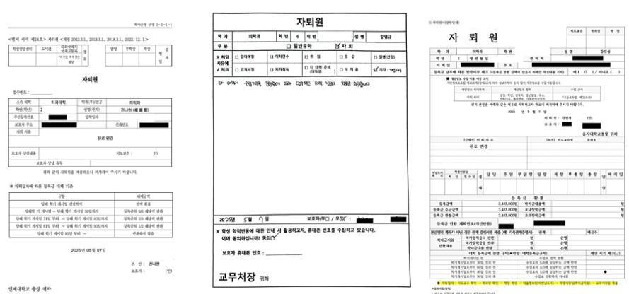 전국 40개 의대 학생 대표들은 7일 자퇴를 결의했다. 왼쪽부터 고대의대, 서울의대, 가톨릭의대 학생대표가 작성한 자퇴원서. 사진=독자 제공
