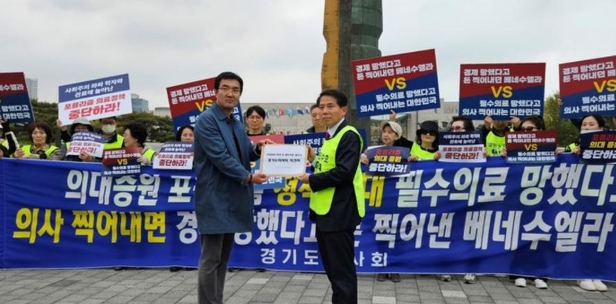 이날 집회는 경기도의사회 회원 50여명이 참석했으며 이동욱 경기도의사회 의료악법 대응 비상대책위원회 위원장이 대표로 의대증원 반대 및 필수의료 살리기 경기도의사회 의견서를 대통령실에 전달했다.