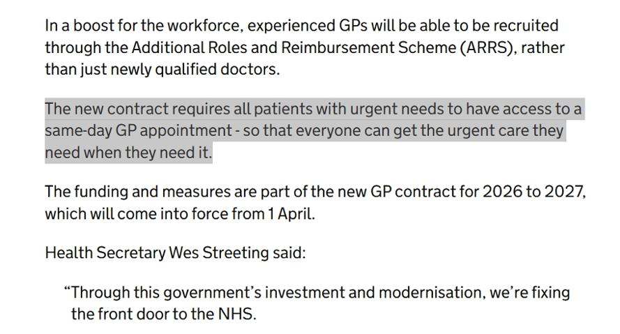 영국 보건부 웨스 스트리팅(Wesley Paul William Streeting) 장관은 "이번 투자를 통해 우리는 NHS 통로를 바로잡고 있다. GP들이 더 많은 의사를 고용할 수 있도록 유연성을 주고 추가 자금으로 지원하고 있다"며 "그 결과 응급 환자들이 연락한 그날 즉시 진료를 받을 수 있게 될 것"이라고 말했다.