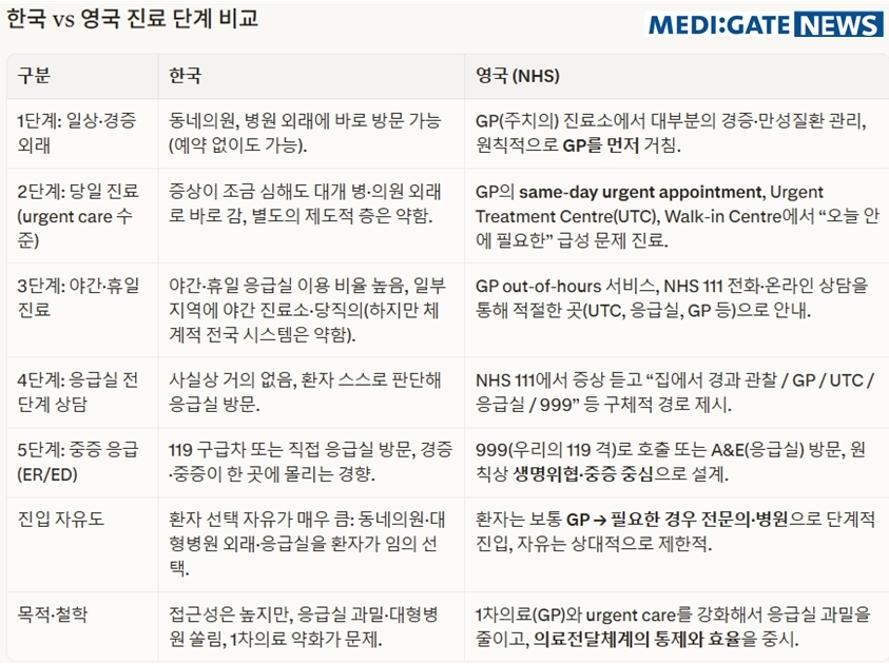 얼핏 보면, 일차의료를 강화해 응급의료 수요를 충족시키는 것이 이상해 보일 수 있지만 영국의 GP는 우리나라 일반의 개념 달리 의대 졸업 이후 별도 수련을 마쳐야 하며, 한국의 가정의학과 전문의와 비슷한 개념이다.