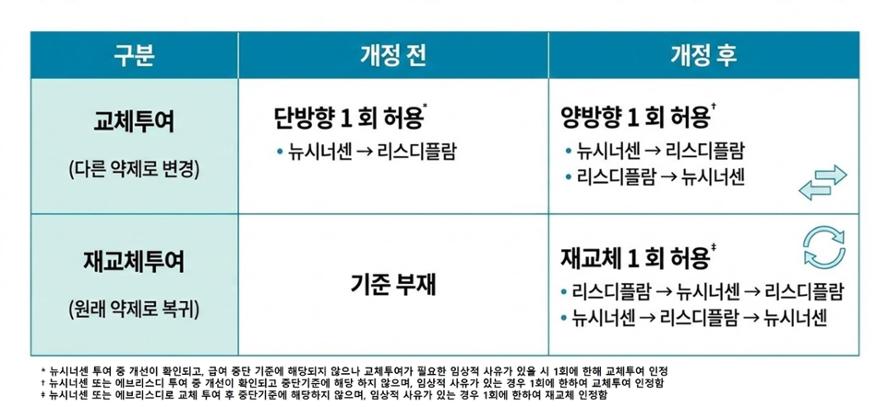 먼저 교체투여 완화와 관련해서는 척수강 주사제(뉴시너센)와 경구제인 에브리스디 간의 보다 유연한 투여가 가능해졌다. 기존에는 해부학적 사유 등 교체투여가 필요한 타당한 사유를 입증한 경우, 척수강 주사제(뉴시너센)에서 에브리스디로의 단방향 교체투여가 1회 가능했다. 하지만 이번 개정을 통해 심각한 불내성 혹은 해부학적 사유 등 임상적 사유가 있는 경우 두 치료 간의 양방향 교체투여가 1회씩 가능하도록 조건이 완화됐다. 또한 약제를 변경했다가 다시 원래의 약제로 돌아오는 재교체 투여에 대한 기준도 마련되어 한층 세밀한 환자 맞춤 치료 전략 수립이 가능해졌다.