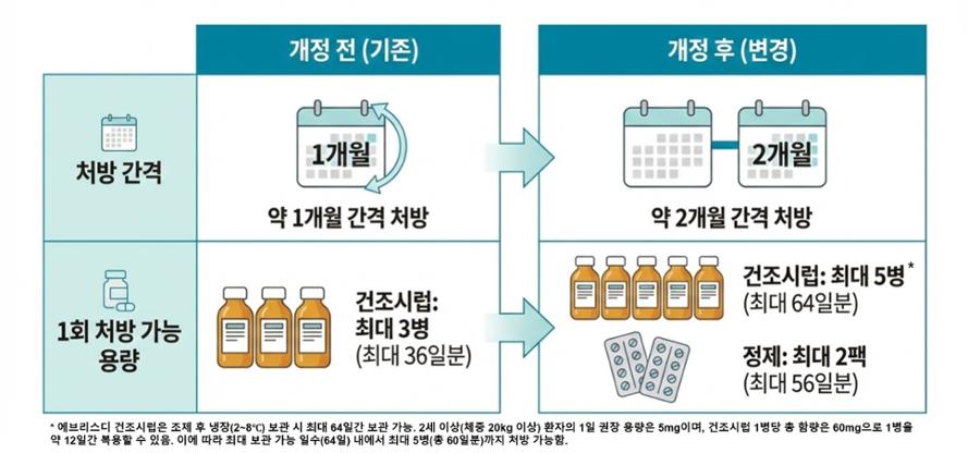에브리스디의 1회 처방 가능 용량도 약 2개월 간격으로 가능하도록 확대됐다. 기존에는 처방 가능한 용량이 약 한 달 분으로 제한돼 경구제의 혜택을 저해하고 환자들의 병원 방문 부담도 컸다. 이번 개정에 따라 정제의 경우 1회 최대 56일분, 건조시럽의 경우 허가사항에 따라 조제 후 냉장 보관 시 최대 64일분까지 처방이 가능해 장기 치료가 필요한 SMA 환자의 복약 편의성과 치료 지속성을 높이는 데 기여할 것으로 기대된다.