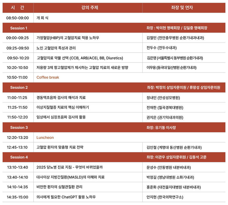 행사는 오전 9시 개회식을 시작으로 세션 1부터 세션 4까지 총 12개의 강연이 진행된다. 세션 1에서는 가정혈압(HBP) 적용법, 고령 고혈압 환자 관리, 항고혈압제 선택, 저용량 3제 요법 등 최신 치료 전략이 제시된다. 세션 2에서는 경동맥·심장초음파 해석과 이상지질혈증 진료 핵심 내용을 다룬다.