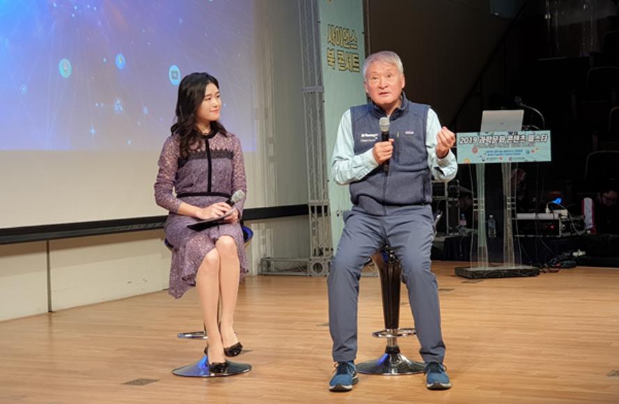 사진: 배진건 박사(오른쪽)가 2019 과학문화 콘텐츠 페스타 북콘서트에서 강연 후 질의응답을 하고 있다.