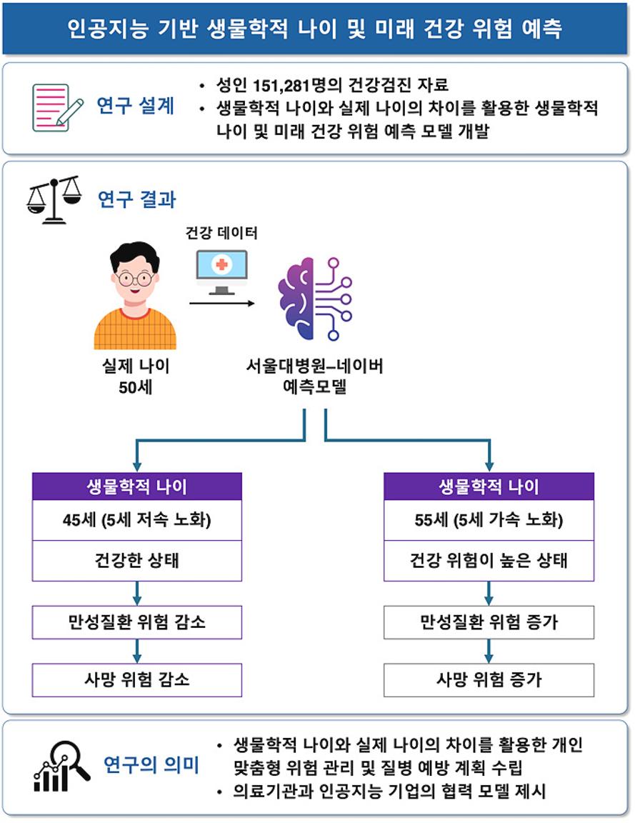 서울대병원과 네이버 공동 연구팀이 건강검진 데이터를 활용해 개인의 생물학적 나이(Biological Age)와 건강 위험을 함께 평가할 수 있는 인공지능(AI) 모델을 개발했다고 7일 밝혔다.