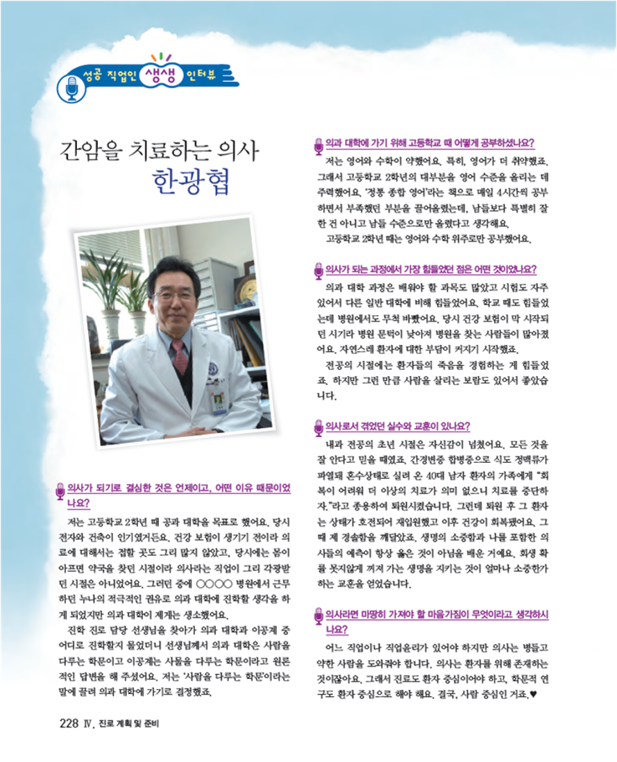 세브란스병원 소화기내과 한광협 교수가 2015학년도 고등학교 교과서 ‘진로와 직업’에 소개됐다.