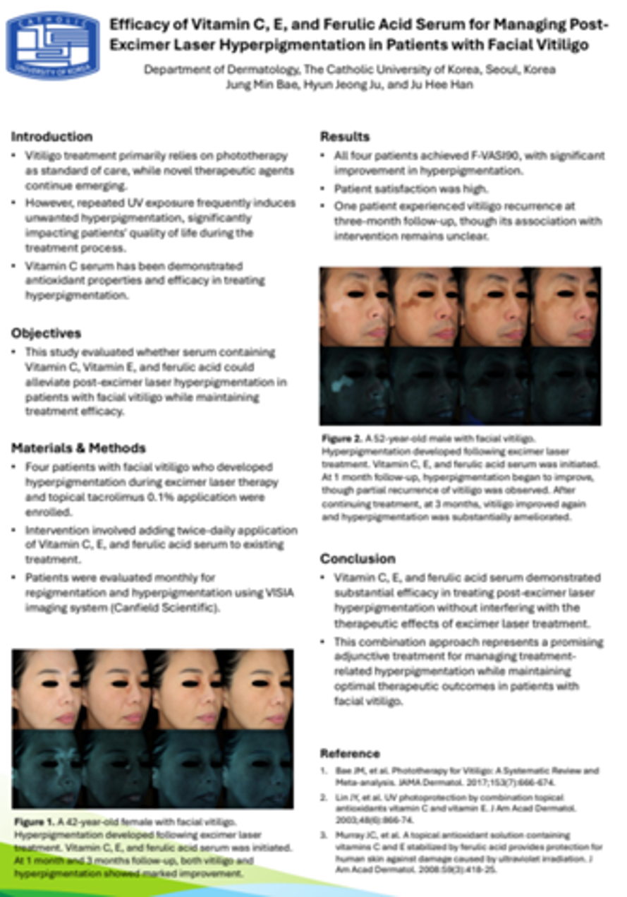 ‘얼굴 백반증 환자의 엑시머 레이저 후 과색소침착 관리에 대한 비타민 C, E 및 페룰릭애씨드 세럼의 효능’이라는 연구 제목으로 진행된 본 연구는 힐하우스피부과 의원 배정민 원장, 가톨릭대학교 피부과 주현정, 한주희 교수 연구팀이 수행했으며, 해당 결과는 유럽피부과학회(EADV)에 e-포스터(e-poster) 형태로 게재됐다.