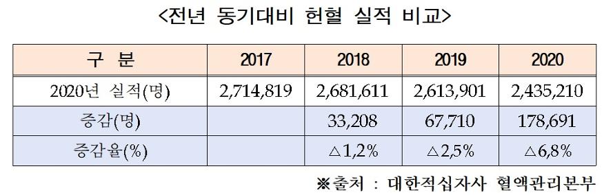 헌혈 실적은 2019년 261만3901명으로 증감율은 -2.5%였던데 반해 2020년 헌혈 실적은 243만5210명으로 증감율은 3배 가량 줄어든 -6.8%를 기록했다.