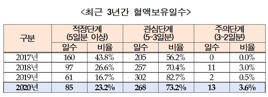 이로 인해, 지난해 혈액적정 보유일수(5일분이상)가 85일(23%)에 불과, 3년전 160일(43.8%)에 비해 절반 수준으로 감소한 것으로 나타났다. 코로나19 사태로 실제 수술이 감소했음에도 불구하고 적정혈액 보유 일수가 유지되고 있지 않은 것이다.
